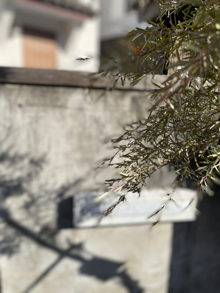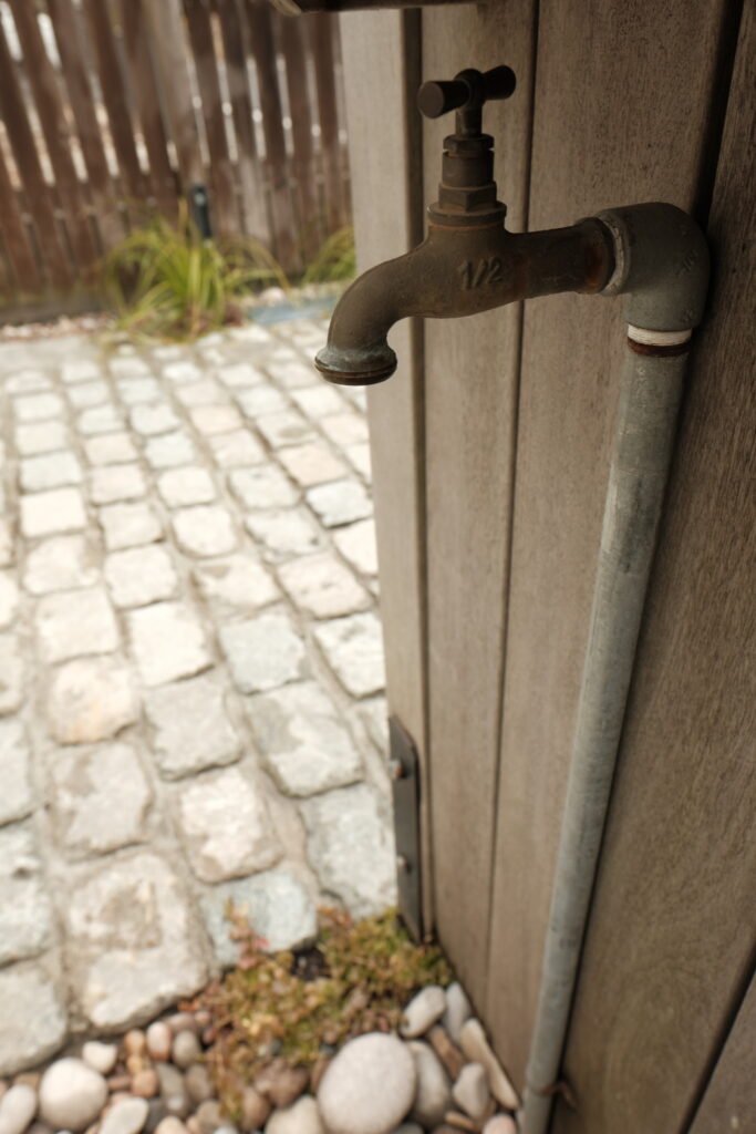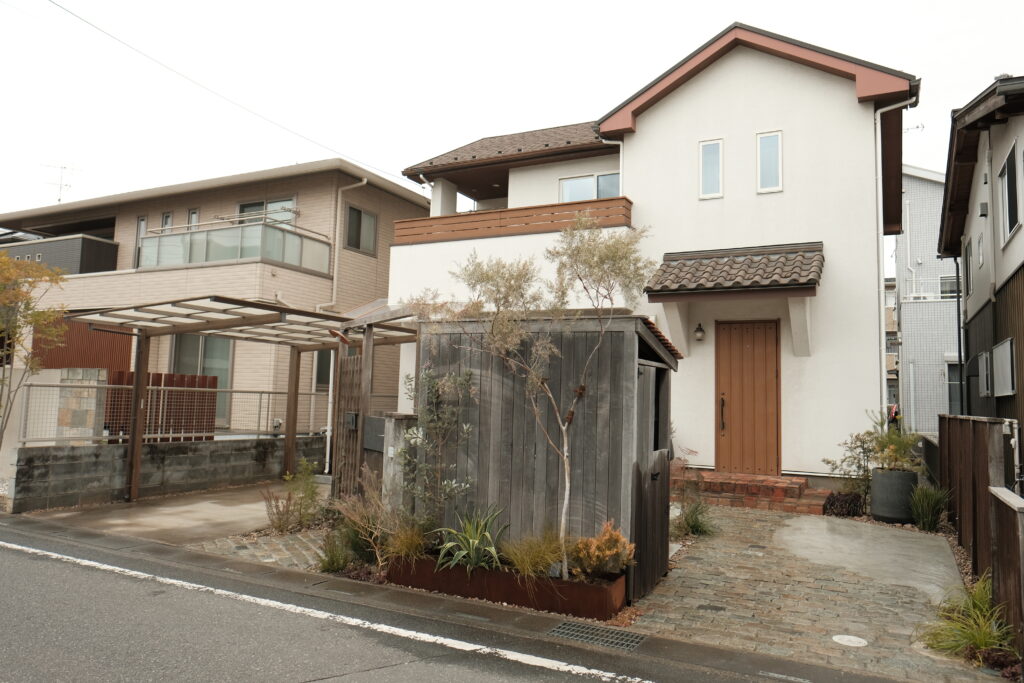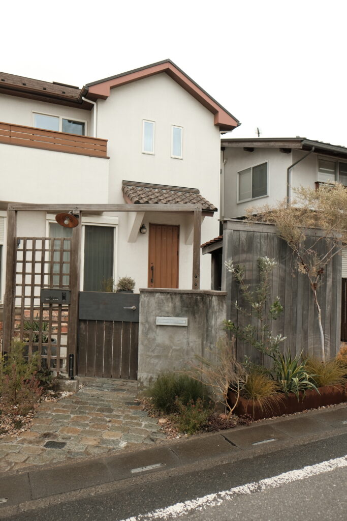 白壁にテラコッタの瓦屋根、味わいのあるハードウッドの自転車小屋、アイアン扉やモルタルの門柱。どれも作り込まれすぎていないのに、ちゃんと時間を感じさせる佇まいでした。