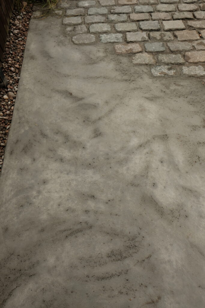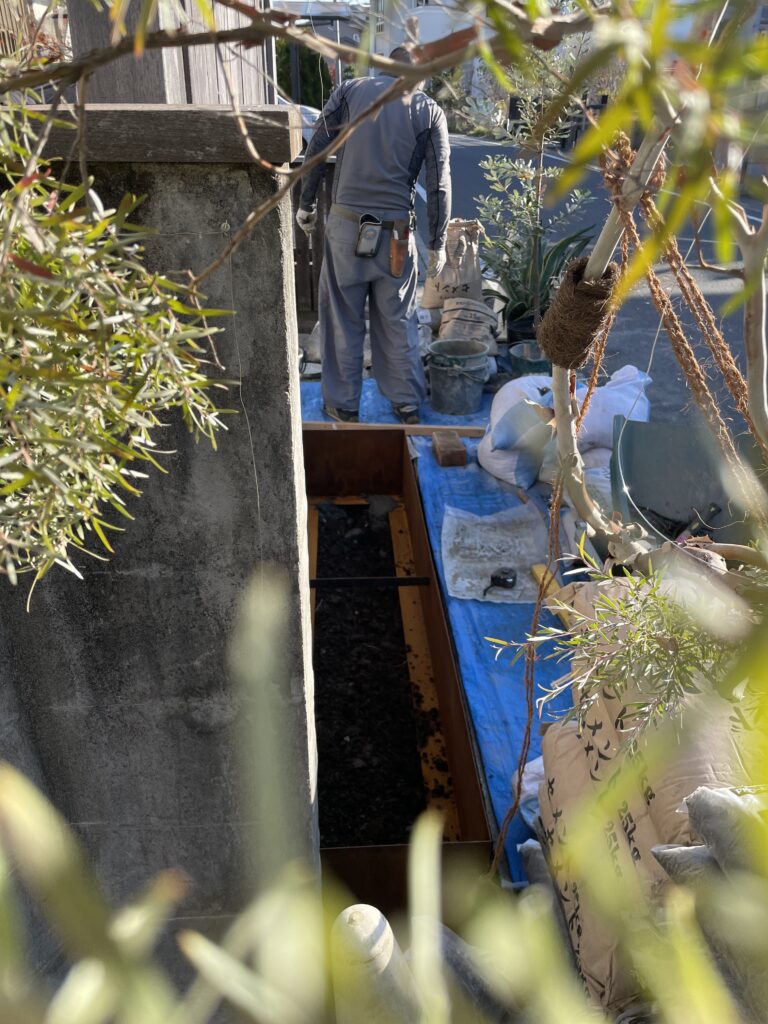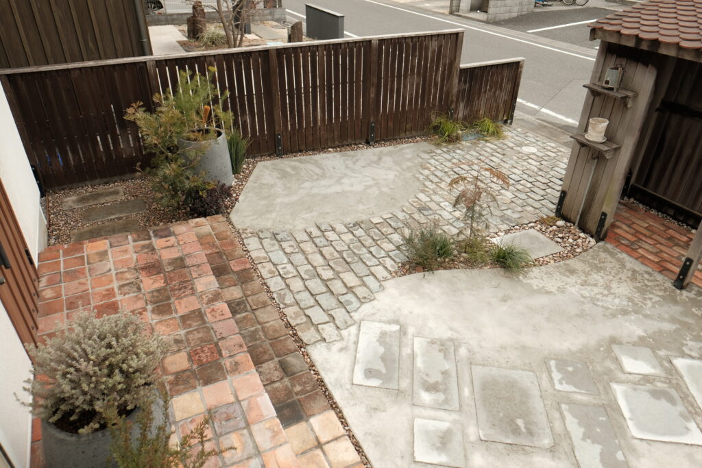 既存のアンティークレンガや自然石は配置を変えて再利用し、新しく加えたベルギーの石畳やコールテン鋼のプランターも最初からそこにあったような存在感になるよう意識しました。仕上げすぎないコンクリートや、点在させたオージープランツもその空気感を壊さないための選択。