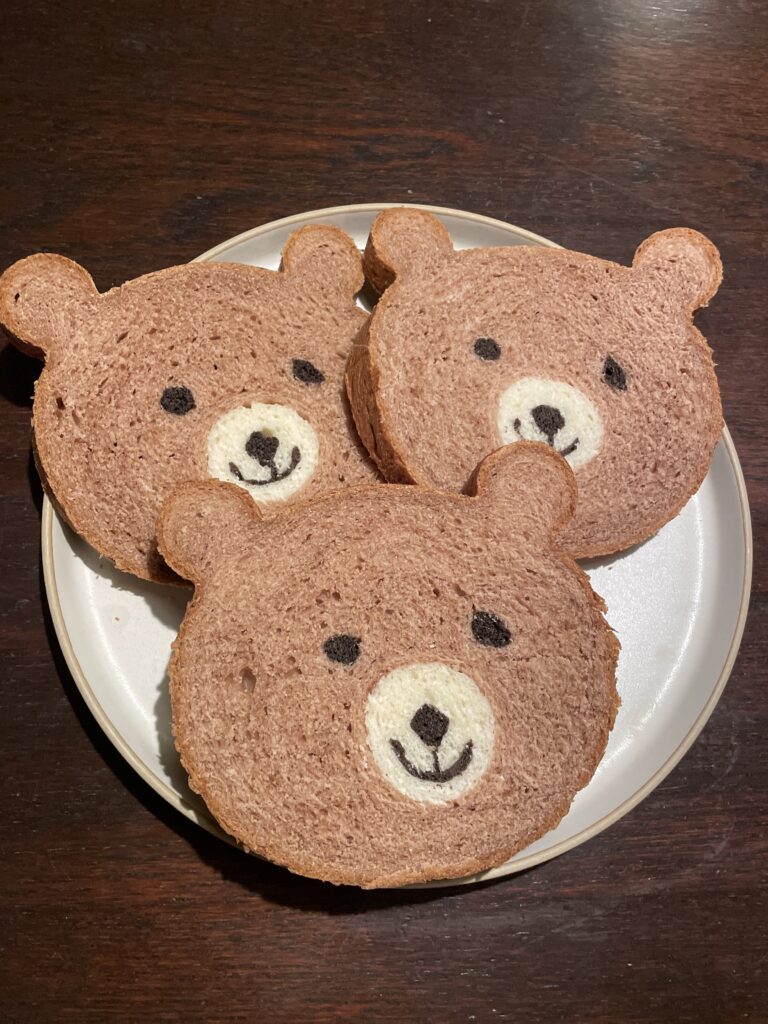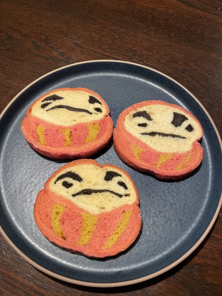 金太郎アメのように輪切りにすると同じ絵柄が現れるパン。クマがいくつも並ぶ断面もダルマの表情もなんとも言えず愛らしい。1月らしい縁起の良さもあって、なんだかあたたかい気持ちになりました。